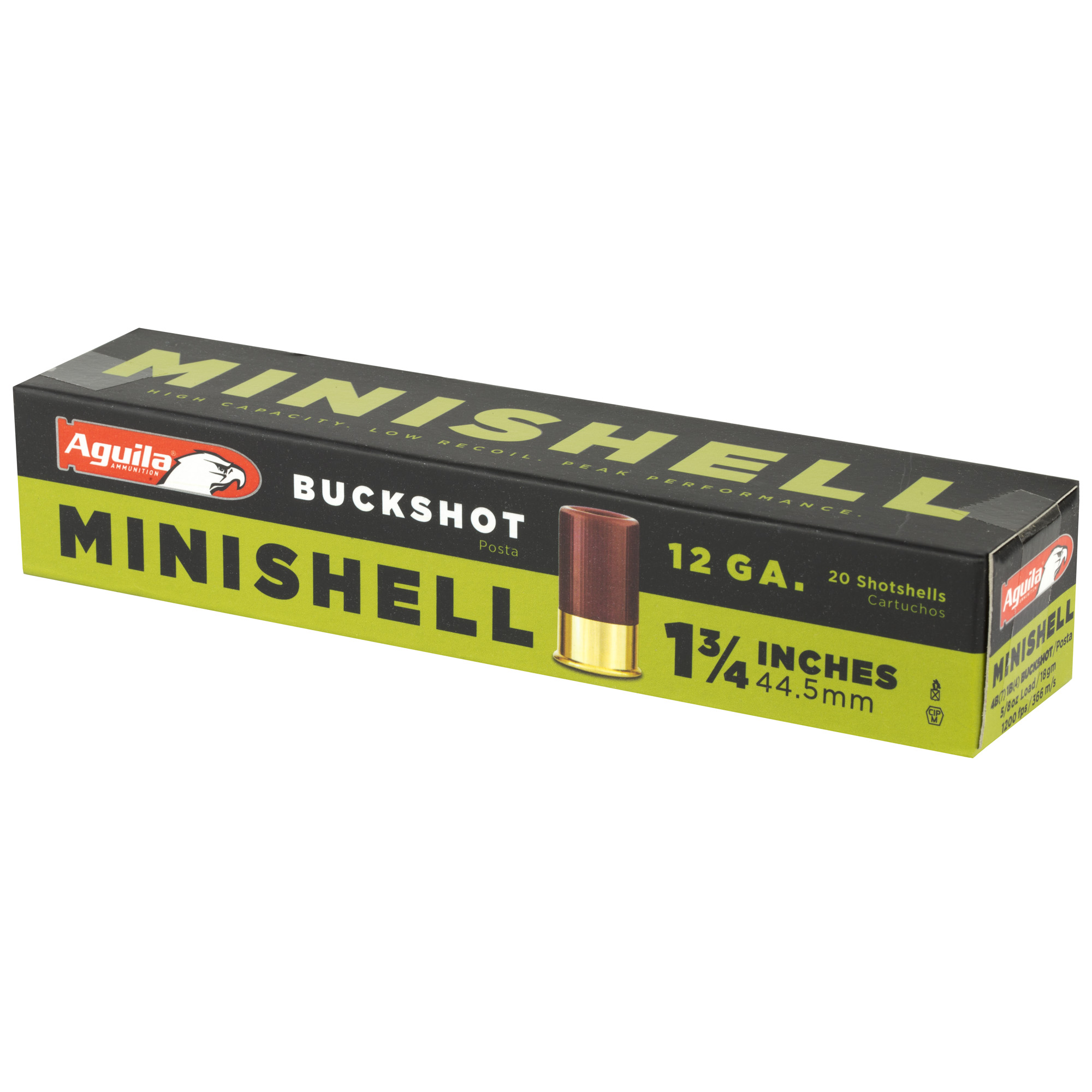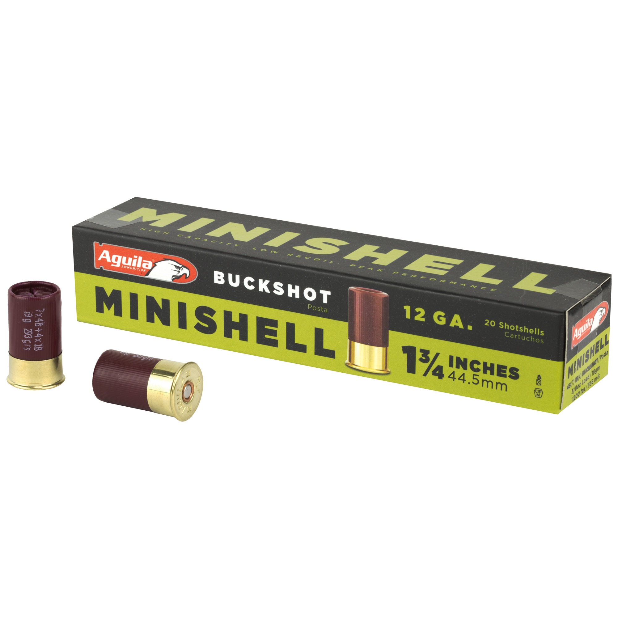 The 1 3/4″ Minishell nearly doubles the capacity of shotguns. Aguila is the only manufacturer offering the Minishell buckshot for hunting or defense purposes. The pellets of this 4B(7p) 1B (4p) buckshot travel at 1″200 ft/sec.