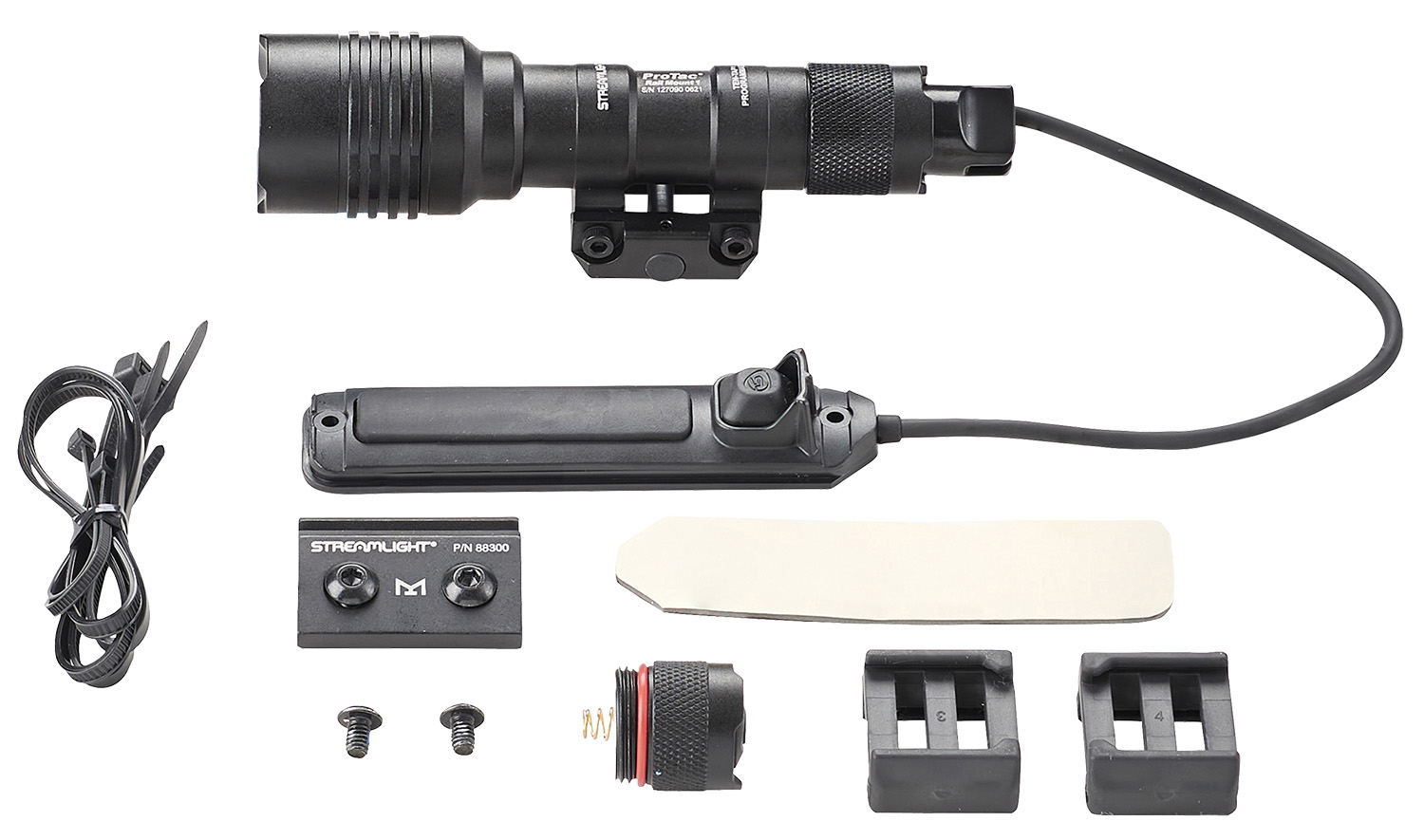 The ProTac Rail Mount 1 features a fixed-mount for Picatinny rails. It uses either a remote switch or a standard push-button switch with momentary/constant or strobe mode. Integrated rail clamp attaches to MIL-STD-1913 rails; easy to attach, secure mounting. The light can run on either a lithium or an alkaline battery. Includes batteries, remote pressure switch, push-button tail switch, remote retaining clips, double-sided tape and zip ties.